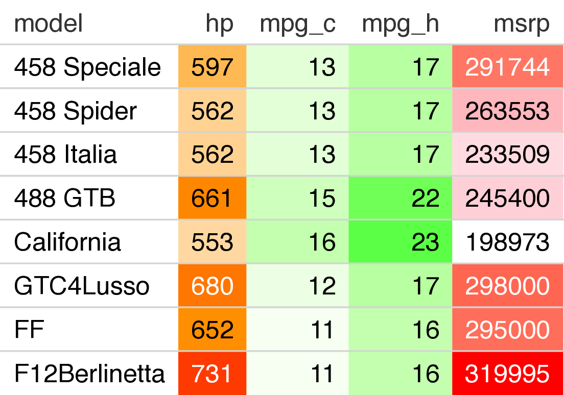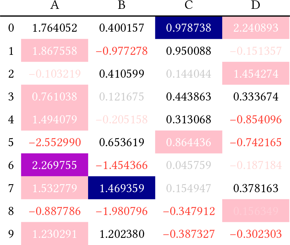 다음은 Quarto가 지원하는 다양한 CSS 속성을 활용해 만든 6가지 HTML 표입니다. 각 예시는 Typst에서도 똑같이 적용됩니다.