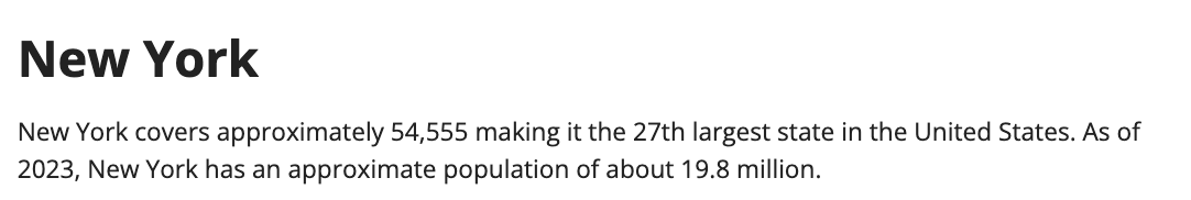 {{< meta state >}} covers approximately {{< meta square-miles >}} making it the {{< meta size-rank >}} largest state in the United States. As of 2023, {{< meta state >}} has an approximate population of about {{< meta population >}}.각 주 파일에서는 YAML 메타데이터에 해당 변수를 정의한 뒤 Include로 facts.qmd를 삽입합니다. 예: ny.qmd 파일의 YAML: