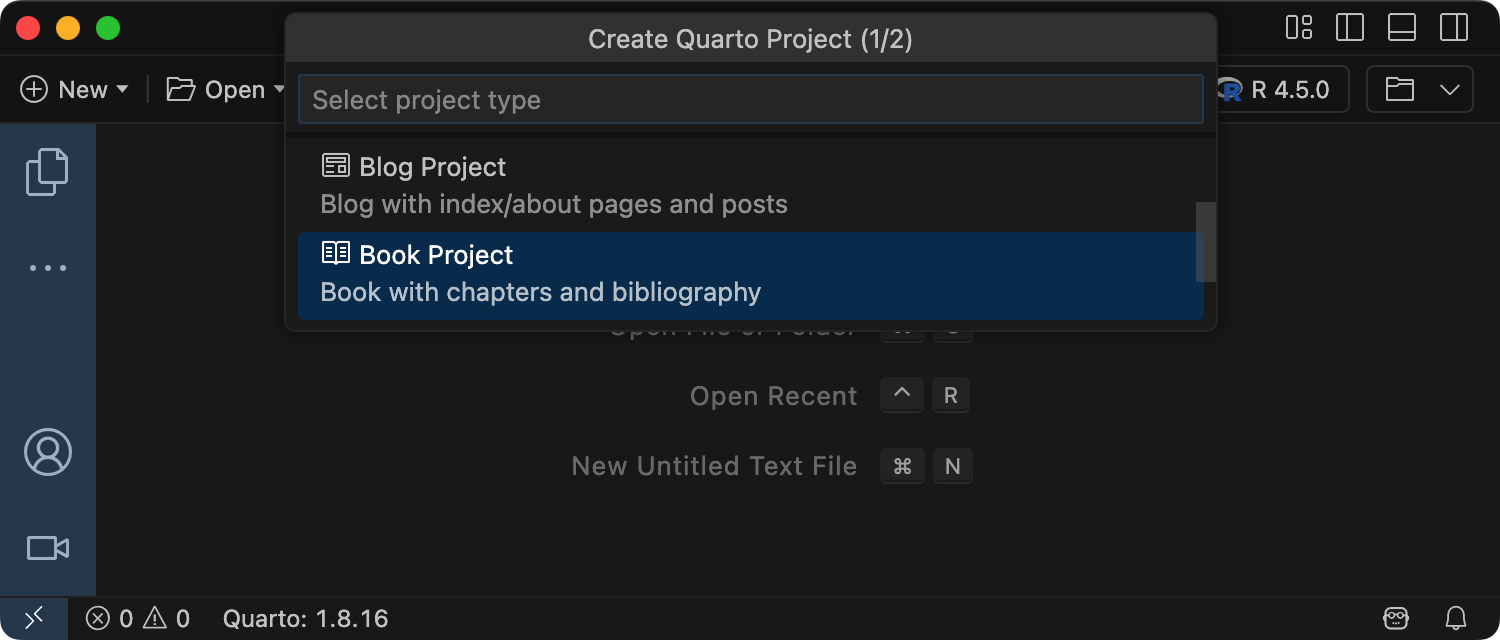 터미널에서 새 책 프로젝트를 만들려면 quarto create project 명령을 사용하고, 프롬프트에 따라 프로젝트 유형과 이름(디렉터리 이름으로 사용됨)을 입력합니다.