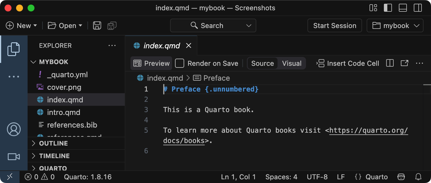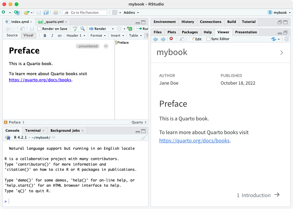그러면 mybook 하위 디렉터리에 간단한 책의 스캐폴딩이 생성됩니다. quarto preview 명령으로 책을 렌더링하고 미리 볼 수 있습니다.