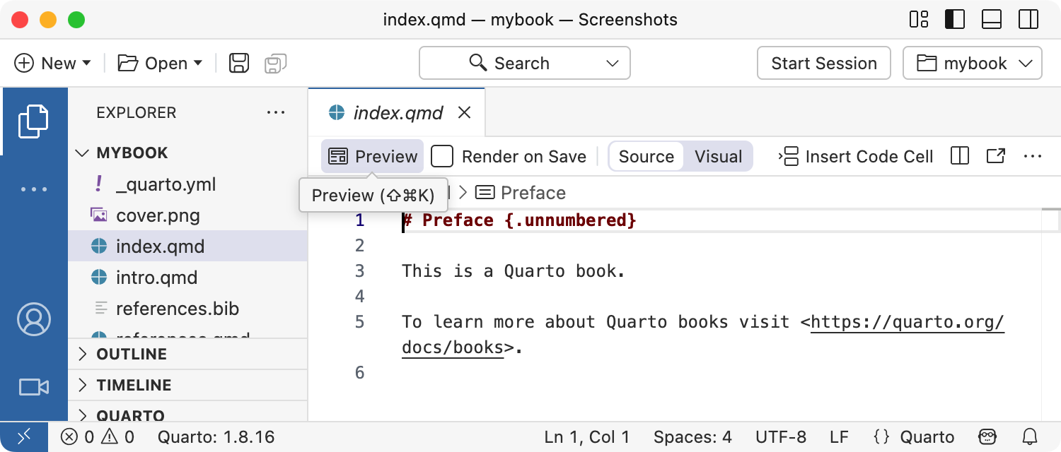 새 책 프로젝트가 생성되어 VS Code에서 열립니다. Preview 버튼(Preview iconPreview icon)을 눌러 책을 미리 볼 수 있습니다.