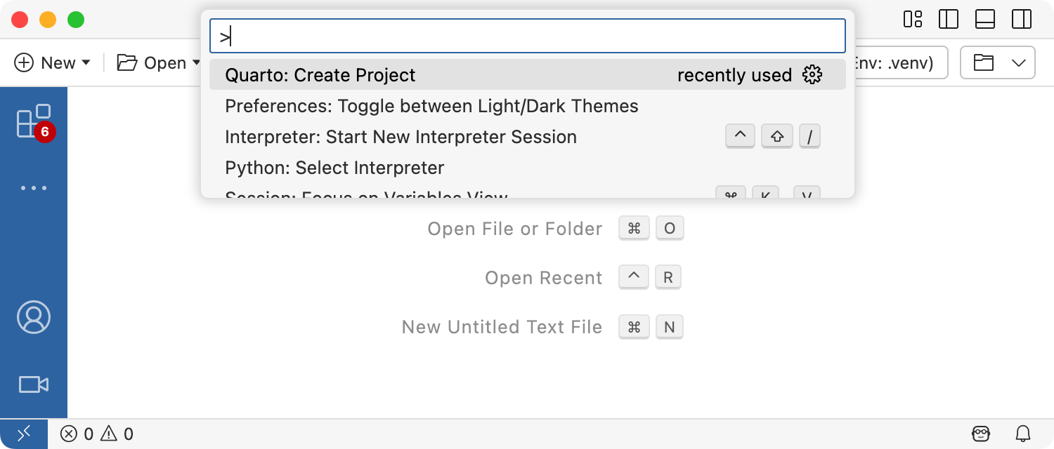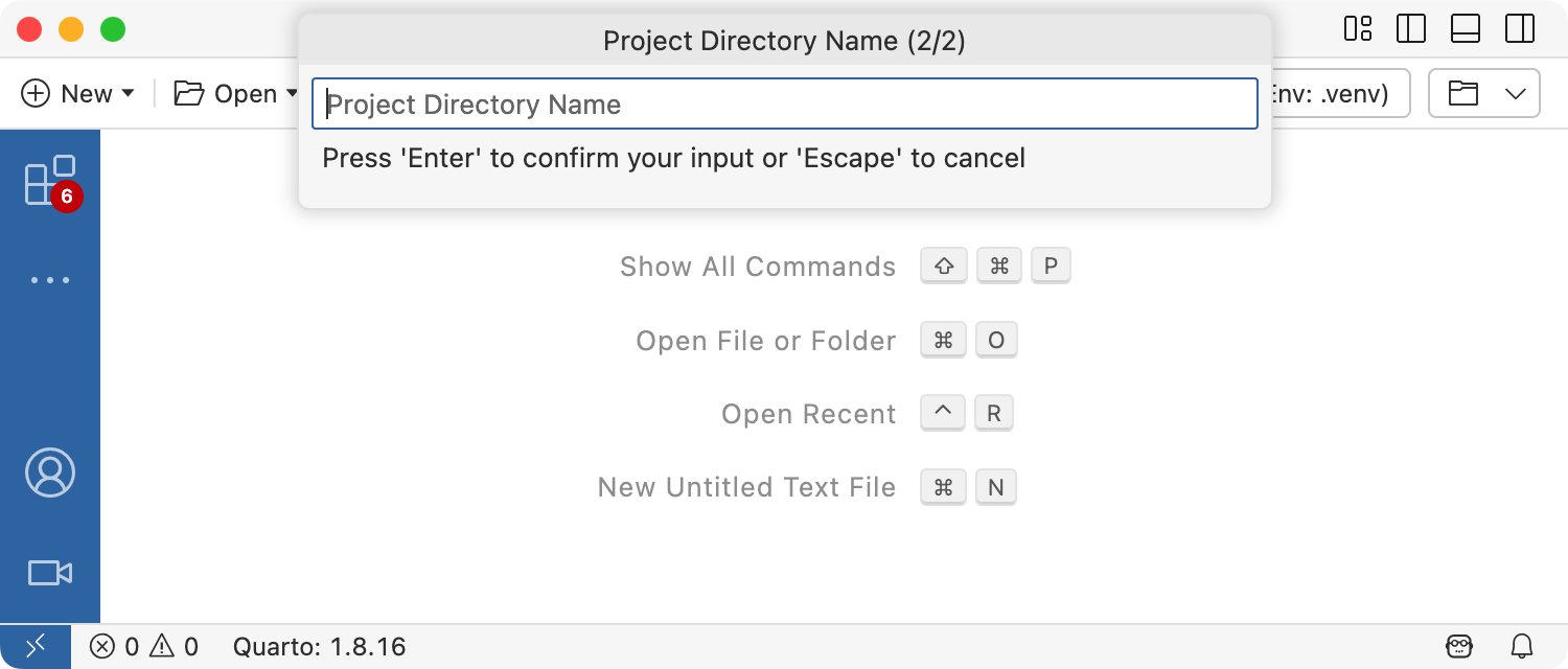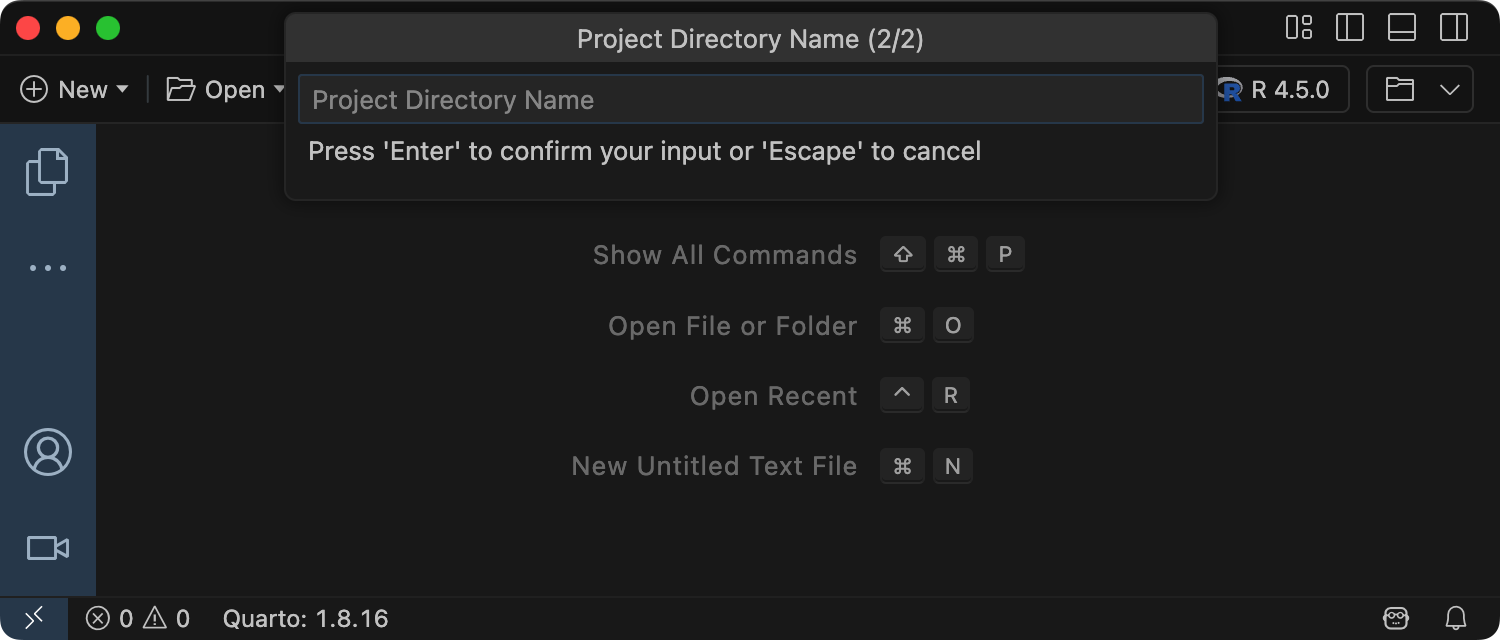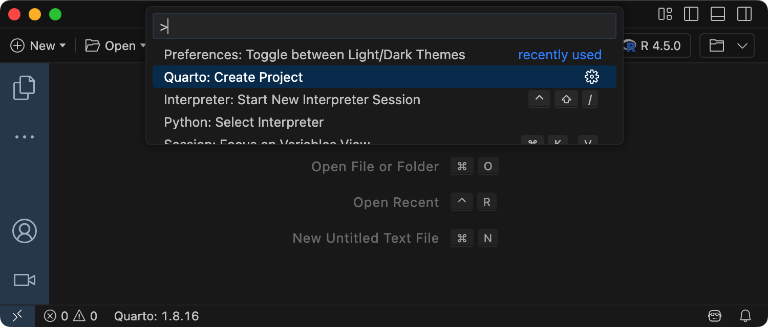 Positron에서 새 책 프로젝트를 만들려면 명령 팔레트에서 Quarto: Create Project 명령을 실행합니다.