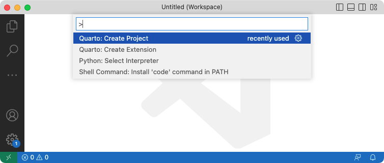 VS Code에서 새 책 프로젝트를 만들려면 명령 팔레트에서 Quarto: Create Project 명령을 실행합니다.