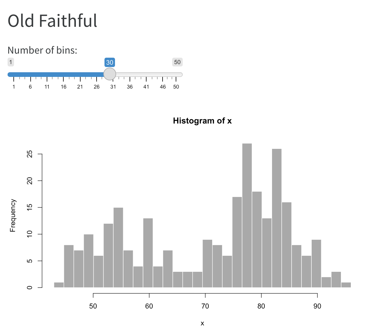 예를 들어 아래 문서는 “Old Faithful” 데이터셋의 플롯과 함께 구간 수를 제어하는 슬라이더를 포함합니다.