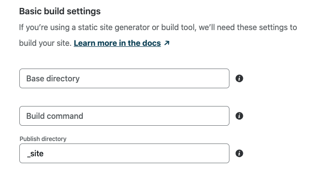 프로젝트의 빌드 설정은 Build command를 비워 두고 Publish directory에 _site 또는 _book(적절한 것)을 지정합니다.