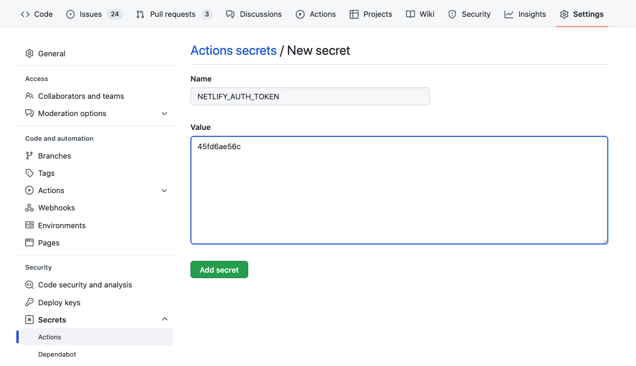 NETLIFY_AUTH_TOKEN이름의 secret으로 추가하세요.