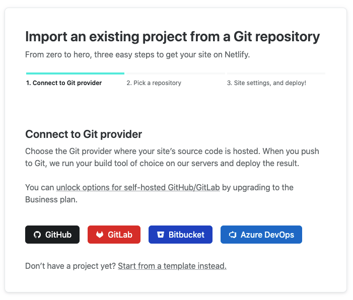 Netlify는 GitHub, GitLab, Bitbucket, Azure DevOps에 호스팅된 Git 저장소에 변경이 커밋되면 자동으로 사이트를 배포할 수 있습니다. 가장 간단한 방법은 렌더링된 사이트(_site 또는 _book 디렉터리)를 버전 관리에 포함하고 Netlify가 이를 배포하게 하는 것입니다. 먼저 이 시나리오를 다룬 다음 Netlify 빌드 플러그인으로 Netlify 서버에서 렌더링하는 방법을 살펴봅니다.