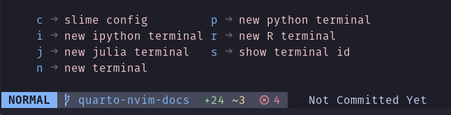 코드 셀을 반복 작업할 때 문서를 완전히 렌더링할 필요는 없습니다. 제공된 설정에서는 리더 키(<space>)를 누른 뒤 c(code)와 p(python) 또는 i(ipython)를 입력해 원하는 터미널을 열 수 있습니다.