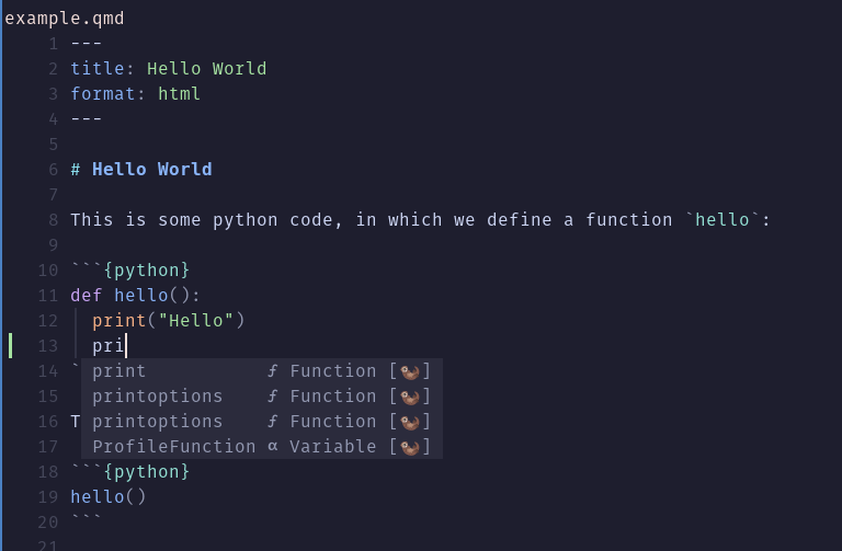 Lua는 이미 Neovim을 구성하는 언어이며 kickstarter 구성은 Lua Language Server를 설치하므로 Quarto 확장 개발을 위한 코드 완성과 진단 기능이 활성화됩니다.