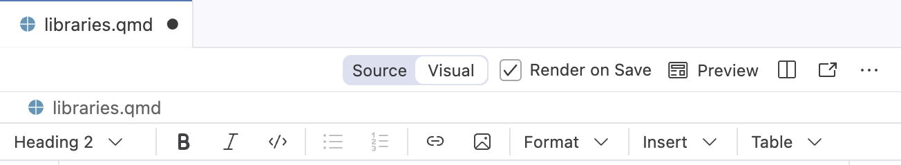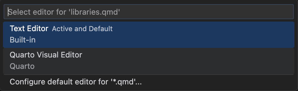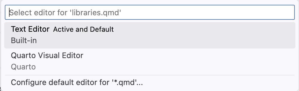 이 메뉴에는 .qmd 파일의 기본 편집기를 설정하는 옵션도 있습니다. 시각 모드로 주로 편집하고 가끔 소스 모드로 전환하고 싶다면 이 옵션을 사용하세요.