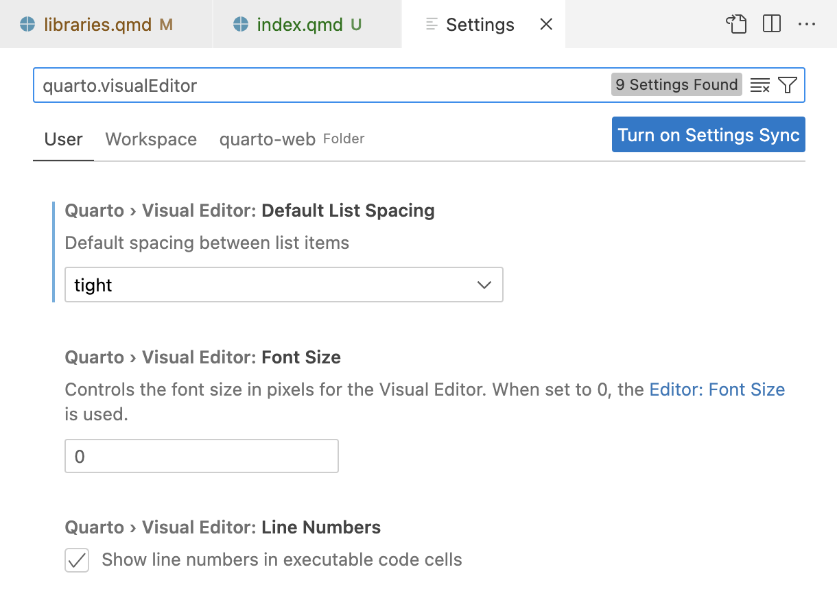 quarto.visualEditor.markdown으로 필터링해 찾을 수 있습니다).문서 또는 프로젝트 수준 YAML에서 지정(아래 설명).