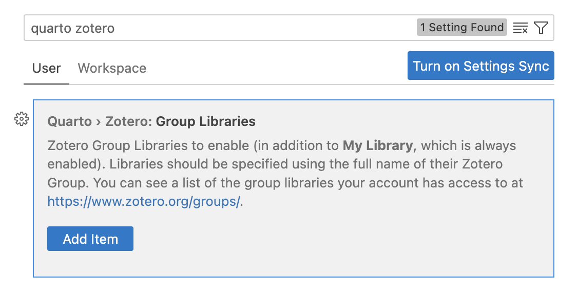 Zotero Groups는 클래스에서 컬렉션을 공유하거나 동료와 프로젝트를 밀접하게 협업할 수 있는 강력한 방법입니다. 기본적으로 Zotero Group Libraries는 Insert Citation 대화상자나 인용 자동 완성에 포함되지 않습니다. 하지만 Quarto > Zotero: Group Libraries 옵션으로 그룹 라이브러리를 하나 이상 활성화할 수 있습니다(전역 또는 워크스페이스별):