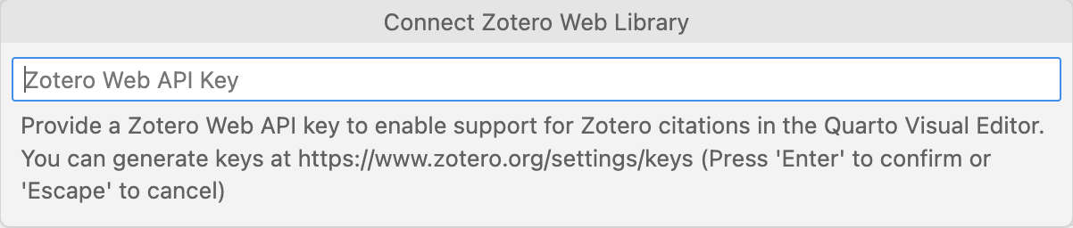 Zotero API 키를 변경해야 한다면 Quarto: Zotero - Connect Web Library 명령을 실행하면 됩니다. 웹 라이브러리를 강제로 동기화하려면 Quarto: Zotero - Sync Web Library 명령을 실행하세요(웹 라이브러리는 자동으로 동기화되므로 일반적으로 이 명령을 직접 사용할 일은 많지 않습니다).