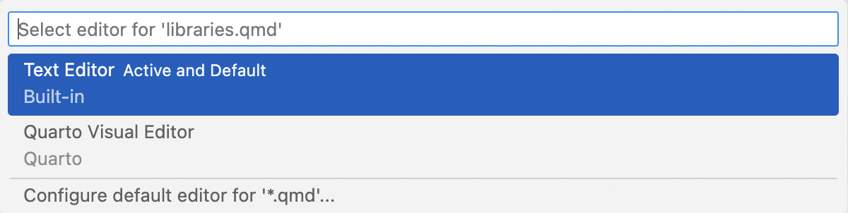 이 메뉴에는 .qmd 파일의 기본 편집기를 설정하는 옵션도 있습니다. 시각 모드로 주로 편집하고 가끔 소스 모드로 전환하고 싶다면 이 옵션을 사용하세요.