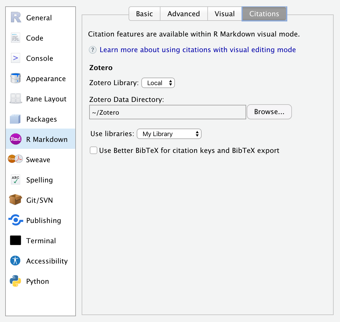 R Markdown -> Citations에서 시각적 편집기 인용 옵션을 사용자 정의할 수 있습니다:
