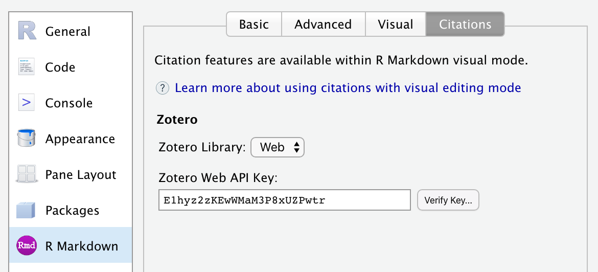 마지막으로 R Markdown -> Citations 환경설정으로 이동해 키를 사용하여 Zotero를 RStudio에 연결합니다: