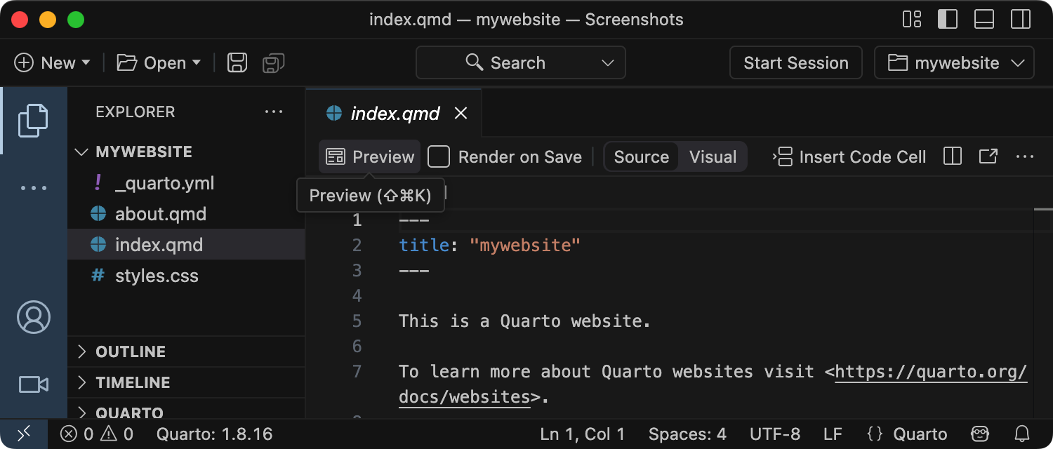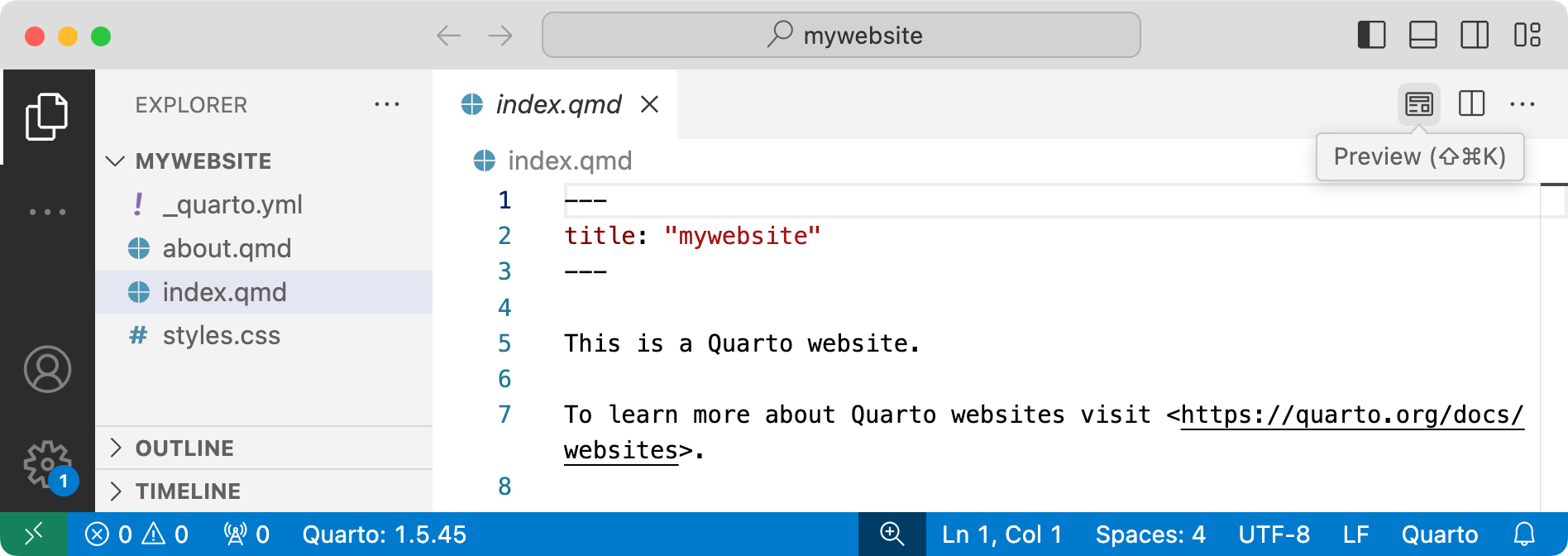 웹사이트 미리보기는 새 웹 브라우저 창에서 열립니다. index.qmd(또는 about.qmd 같은 다른 파일)를 편집하고 저장하면 미리보기가 자동으로 업데이트됩니다.