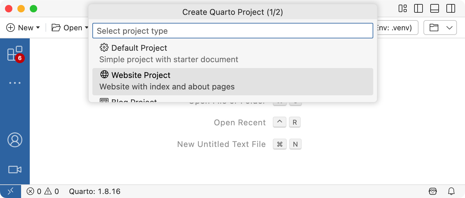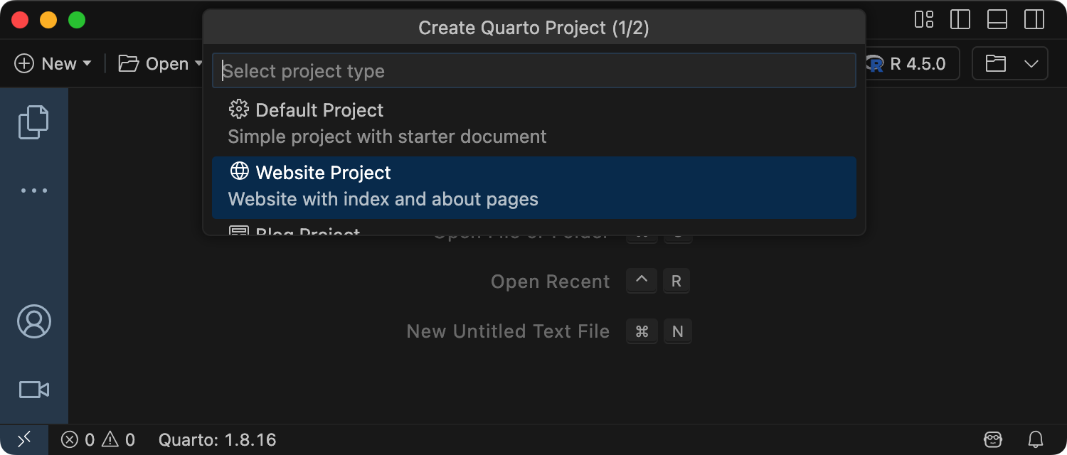 Positron에서 새 웹사이트 프로젝트를 만들려면 명령 팔레트에서 Quarto: Create Project 명령을 실행합니다: