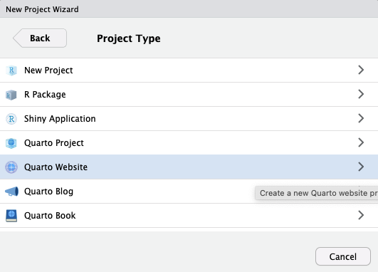 RStudio에서 새 웹사이트 프로젝트를 만들려면 New Project 명령을 사용하고 Quarto Website를 선택합니다: