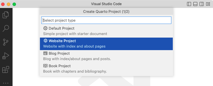 VS Code에서 새 웹사이트 프로젝트를 만들려면 명령 팔레트에서 Quarto: Create Project 명령을 실행합니다: