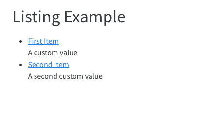 렌더링 시 위 템플릿은 items라는 listing 항목 배열을 받습니다. listing 콘텐츠가 문서 목록에서 로드된 경우 각 항목은 Listing Fields에서 설명한 필드로 채워집니다. 또한 문서 메타데이터에 포함된 다른 필드도 항목의 속성으로 전달되므로, 사용자 정의 메타데이터를 문서와 listing 표시에서 사용할 수 있습니다.